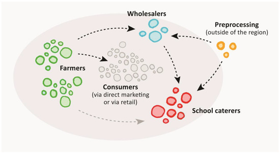 An agri-food value chain is a strategic partnership among interdependent businesses—such as farms, processing companies, and intermediaries—who work together to jointly create added value. To describe the level of value chain organization and partnership between firms in agri-food value chains, Peterson, Wysocki, & Harsh [17] define a continuum from low intensity, ‘invisible hand’ coordination (spot markets) to high intensity, ‘managed’ coordination (vertical integration). Several researchers have examined alternative approaches to organizing agri-food value chains for school catering. The most cited examples are farm-to-school programs, which aim to increase the share of locally produced food in school lunches in the USA by connecting food producers directly with schools in a collaborative program [18]. Local school catering value chains are commonly described using concepts such as short food supply chains and values-based supply chains, e.g., [15,19,20,21]: