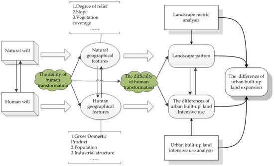 Although a few studies have concentrated on comparing the urban built-up land expansion in different cities [39,40], they didn’t reveal any differences in terms of geographical features and only analyzed the factors that caused these differences. Therefore, in this paper, we have selected two cities that have similar economic and social conditions, which means that they have similar human geographical features, but had quite different natural geographical features during the initial period of study. Due to the difference between natural will and human will, mankind will continue to transform the natural geographical features and develop human geographical features in the coming decades, but they will encounter great difficulties due to their limited capability to transform these features. Will doing this lead to differences in human geographical features and in urban built-up land intensive use after several decades? This study explores whether the landscape patterns and the economic–social structure have undergone profound changes according to a landscape metric analysis and an urban built-up land intensive use analysis, and analyzes the mechanism that underlies urban built-up land expansion (Figure 1).