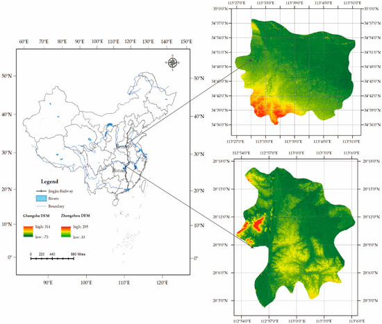 This study analyzes the urban built-up land expansion in Zhengzhou and Changsha. Zhengzhou and Changsha are both in China’s abdomen, and are both national center cities. Also, they are connected by a North–South axis and are crossed by the main traffic road that connects the South and North. Zhengzhou is the capital city of Henan province, which carries 5000 years of history in China. Changsha is the capital of Hunan province, which carries the history of the modern Chinese military revolution and the development of the Chinese Communist Party. In summary, considering the extreme similarities between the cities, this study would analyze the characteristics of urban built-up land expansion purely from the perspective of geographical features, so as to deeply reveal the mechanism that underlies urban built-up land expansion.