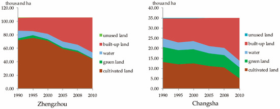 Based on the results from the land-use classification for 1990, 1995, 2000, 2005, 2008, and 2010, the change in the land-use types was analyzed in the two cities, and an obvious change in the composition of the different land-use types was found. However, the change was different for each city. In Zhengzhou, the proportion of built-up land increased from 17.97% to 48.98% during the period 1990–2010; however, the proportion of the cultivated land and green land decreased from 68.11% to 42.11% and from 2.21% to 0.49%, respectively. Also, the proportion of water area decreased from 11.14% to 8.42%. Similarly, in Changsha, the proportion of built-up land increased from 28.56% to 60.42%, during the period 1990–2010; however, the proportion of cultivated land, green land, and water area decreased from 37.93% to 14.57%, from 21.26% to 15.30%, and from 12.13% to 9.70%, respectively. The trend of changes is similar between Zhengzhou and Changsha (Figure 3).