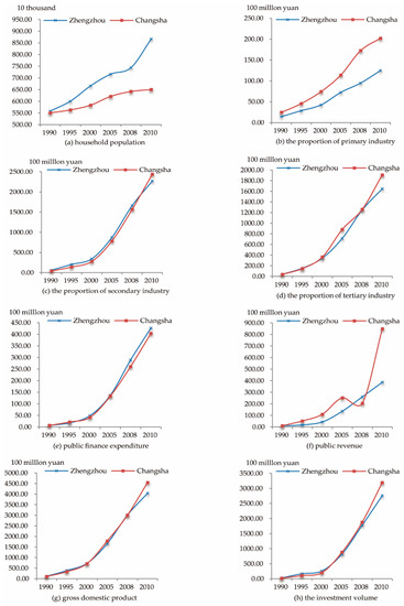 As can be seen from Figure 4, the indicators of human geographical features have shown regular and continuous growth in the two cities; however, the growth rate is different. The two cities exhibited different trends in household population growth. Zhengzhou’s household population showed explosive growth during the next two decades; however, Changsha’s increased slowly (Figure 4a). The growth trend of different industrial output value was different. The output value of Changsha’s primary industry had always been higher than that of Zhengzhou’s. However, the growth trends of the secondary industry and the tertiary industry were similar, which led to the amount of gross domestic product being basically the same from 1990 to 2010 (Figure 4b,c,d,g). In addition, Changsha’s public finance expenditure growth trend was similar to Zhengzhou’s, and Changsha’s investment volume growth trend was also similar to Zhengzhou’s. Nevertheless, Changsha’s public revenue fluctuated sharply in 2008; afterward, the amount of public revenue in Changsha was larger than that in Zhengzhou’s (Figure 4e,f,h).