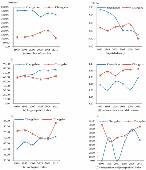 In terms of NP in the built-up area, the number of patches in Zhengzhou was significantly larger than that in Changsha (Figure 5a). The patch density showed a declining trend year by year, and there was an obvious decrease in Zhengzhou, which indicates that the urban built-up land in Zhengzhou was relatively fragmented (Figure 5b). However, the largest patch index increased from 1990 to 2010 (Figure 5c).