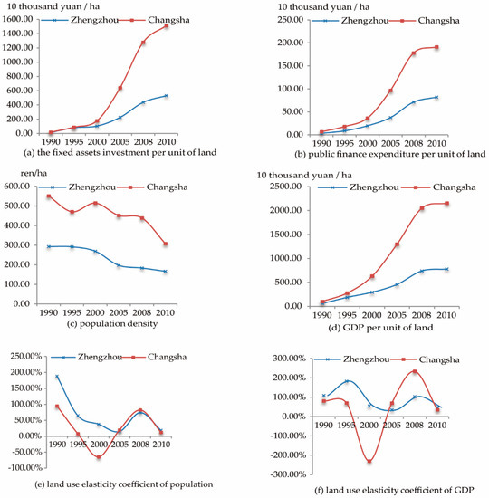 Judging from the population density (Figure 6c), the density became smaller as time went by in both cities, and Zhengzhou’s population density was lower than Changsha’s. However, Zhengzhou’s population was larger than Changsha’s, which shows that the built-up land use in Zhengzhou was more extensive than that in Changsha. From the perspective of the land-use elasticity coefficient of population (Figure 6e) and the land-use elasticity coefficient of GDP (Figure 6f), Changsha showed a negative value in 2000. The reason for this was that the value of land growth in the built-up land was negative according to the original data. On the other hand, the value of the two indicators was larger before 2000, which reveals that land was not the major driving factor of economic growth at that time. However, after 2000, the two indicators showed violent fluctuations. The value of the two indicators in Changsha has been larger than the value of the two indicators in Zhengzhou since 2005, which shows that population and economic growth in Zhengzhou were becoming increasingly dependent on the expansion of urban built-up land, while the dependence of Changsha on urban built-up land was lower.