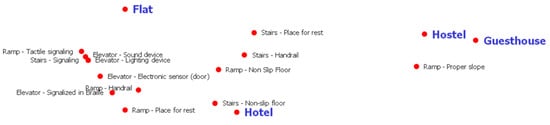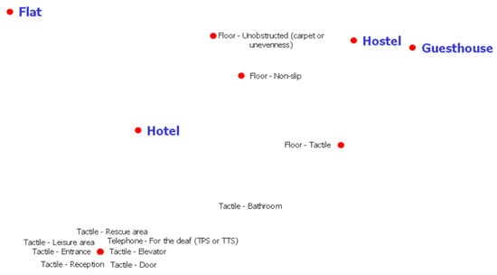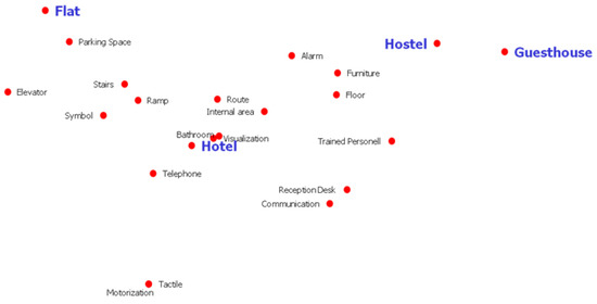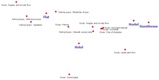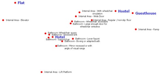 In Figure 1, it can be seen that the whole parking, elevator and stairs part is closer to the Flats, while ramp, internal route, internal area, telephone, bathroom, and all related information visualization are related to Hotels. However, emergency alarm, floor, and personnel are characteristics more related to hostels and guesthouses. This analysis follows the trend that is characterized by flats and hotels investing in infrastructure (more significant financial investment), while hostels and guesthouses prioritize equipment of low cost and the humanized service.