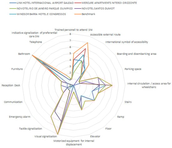 In the analysis of civil construction projects, it is observed that these are relatively new hotel units (some of them inaugurated for mega events) and are chain hotels (which represents an investment capacity in more elaborate and updated infrastructures). However, it should also be noted that the most relevant and impacting items from the point of view of investment in civil construction projects were the items (of these hotel units) that are closer to benchmarking. These are: “bathrooms”, “accessible external route”, “accessible traffic area”, and “signaling”.