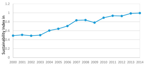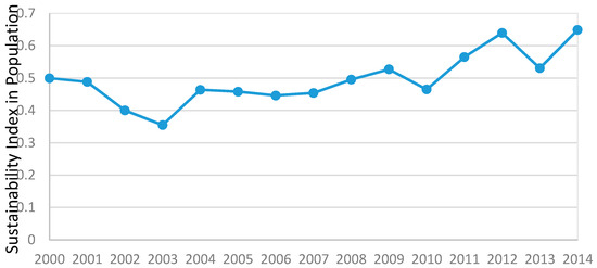 Figure 1 shows the sustainability trend of the population over the period examined. It is observed that the sustainability sub-index of the population has declined from the beginning till 2003, and then it trends upwards afterwards, except for temporary drops in 2010 and 2013.