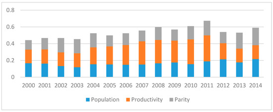 Figure 3 shows the sustainability trend of parity. It reveals that the sustainability index for the parity dimension had improved before 2002, but it fluctuated afterwards until 2012. Since 2012, the parity sub-index has increased stably; indicating that the parity development of Singapore has gradually moved from an unsustainable situation towards sustainability.