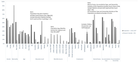 The sociodemographic characteristics of 416 respondents in the used sample are compared to characteristics of the targeted population of 5,962,503 people aged 19 years or older living in the western region of Saudi Arabia in 2017 (Figure 1). This is to check for level of representativeness of the collected sample. The 2017 population data was adopted from the General Authority of Statistics, Kingdom of Saudi Arabia [65]. Figure 1 compares percentages of demographic groups used in this research study. Despite the higher percentage of Saudi respondents in the sample versus the non-Saudis when compared to population percentages, the sample is representative, because non-Saudi residents are most likely to be a transient workforce, and almost all real estate properties are owned by Saudi citizens.