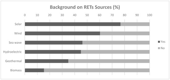Varied results were seen on the participants’ background on the different types of RETs (see Figure 2). The results show that the majority of survey participants were familiar with solar RETs, but were unfamiliar with biomass RETs. Thus, out of the six RETs considered in this study, 76.7% of participants were aware of solar energy, followed by 60.3% of participants being aware of wind energy. Both sea wave energy and hydroelectric energy had very similar numbers at 46.2% and 45%, respectively. Participants with background knowledge on geothermal energy represented 34.9% of the sample. Finally, only 15.4% of participants had a background on biomass energy.
