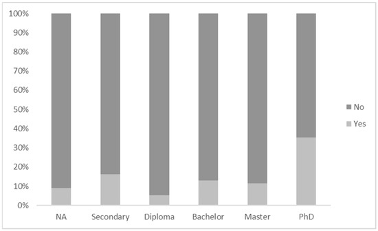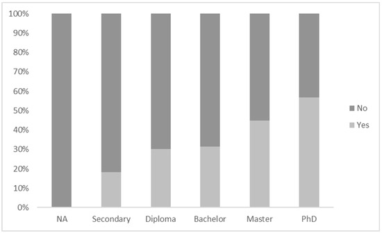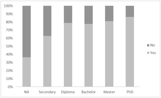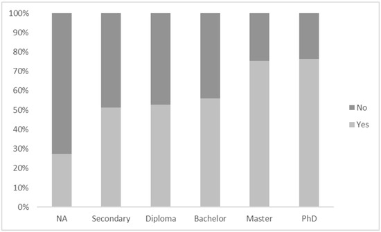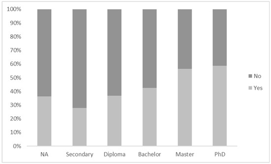 As mentioned earlier in the Methodology section, the χ2-test was used to study correlations between sociodemographic characteristics of respondents and the level of background knowledge on each of the six RETs, as well as willingness perspectives to adopt RETs. Table 2 presents only statistically significant correlations between all tested sociodemographic characteristics and background knowledge. Table 2 reveals statistically significant correlations between educational level and background knowledge on five RET sources (namely solar, wind, geothermal, hydroelectric, and biomass) and between nationality and sea wave RET. Figure 3, Figure 4, Figure 5, Figure 6 and Figure 7 present bar charts of respondents’ background knowledge on RET sources based on percentages within their educational level categories. Positive correlations between educational level and background knowledge on the five RET sources mentioned earlier are evident from the charts. Figure 8 shows that a higher percentage of non-Saudi respondents have background knowledge on the sea wave RET than Saudi national respondents.