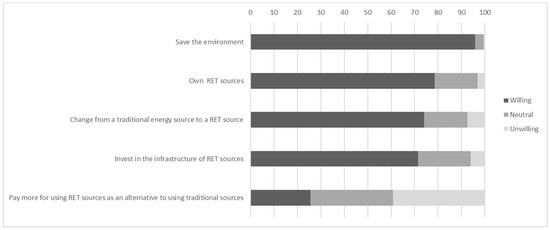 Participants’ willingness was examined against five perspectives related to RET adoption. The perspectives were: (1) save the environment; (2) own an RET source; (3) change traditional source of energy to an RET source; (4) invest in an RET source infrastructure; and (5) pay more for energy by using an RET source instead of a traditional source. The data analysis in Figure 9 shows that saving the environment was found to be the highest willingness perspective for participants, with a majority of participants (96%) having expressed willingness to save the environment. For owning an RET source, changing to an RET source and investing in an RET source infrastructure, the participants’ willingness perspectives were similar at 79%, 74%, and 72%, respectively. Only 26% of the participants were willing to pay more for RET sources over traditional sources, meaning the majority are not willing to spend more money to adopt RET sources.