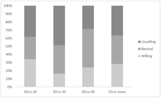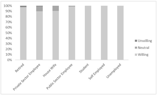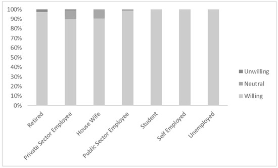 Figure 10 presents bar charts of respondents’ willingness to save the environment based on percentages within their employment status categories. Results showed that most respondents were willing to save the environment based on employment status. A small proportion of 9.4% and 9.3% of housewives and private sector employees, respectively were neutral to the topic. A very small percentage of 2.5% and 0.9% of retired and private sector employees were unwilling to pay, respectively. Results in Figure 11 show that 4.07% and 7.58% of respondents 18–29 and 30–39 years old were neutral about saving the environment, respectively. Additionally, a very small 1.35% and 0.81% of respondents aged 50 years or older and 18–29 years were unwilling to save the environment, respectively. Notably, none of the respondents aged between 30 and 49 years were unwilling to save the environment.