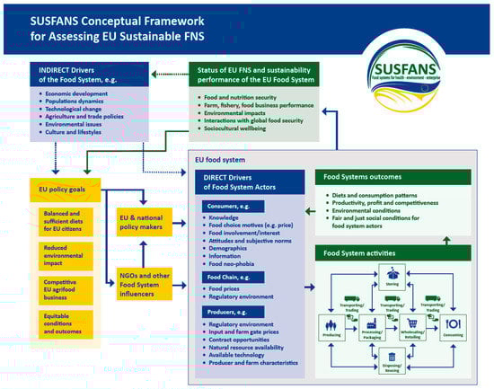 - Zurek, M.; Ingram, J.; Zimmermann, A.; Garrone, M.; Rutten, M.; Tetens, I.; Leip, A.; Veer, P.; Verain, M.; Bouwman, E.; et al. D1.1 A Framework for Assessing and Devising Policy for Sustainable Food and Nutrition Security in EU: The SUSFANS Conceptual Framework; SUSFANS, GA No. 633692; SUSFANS: The Hague, The Netherlands, 2016. [Google Scholar]