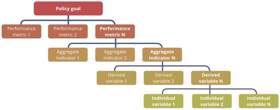The sets of performance metrics describing each policy goal are described in Table 1. A draft set of individual and derived variables, substantiating the aggregate indicators and performance metrics, as well as objectives for aggregate indicators is given in Reference [].
