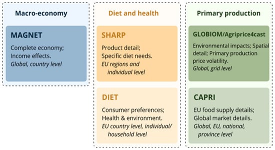 In the project, this was done by building on already existing state-of-the art models such as MAGNET [], DIET [], CAPRI [,] and GLOBIOM [,] and the development of a new tool to define model diets that perform well on sustainability and health objectives (SHARP) []. However, each of these have been developed to serve a specific sectoral policy—e.g., CAPRI has been developed for the EU agricultural policy, and DIET was designed for the purpose of assessing the social welfare impact of dietary change in the population at country level (see Figure 3). Taken separately, they are not designed for integrated assessments such as we argue for in this paper. Using the models in combination allows a consistent assessment across the different domains covered by each individual model. In addition, the combined models better capture diets, include seafood production and aim to portray synergies between sustainability and nutrition outcomes. For more detailed information about the developed integrated modeling strategy see References [,]. Regardless, three important deficiencies for food system assessment remain, namely actors behaving rationally by responding to ‘perfect information’ (see Section 4) are key for the models, food chain actors are not well represented in all models, and not all metrics can so far be quantified.