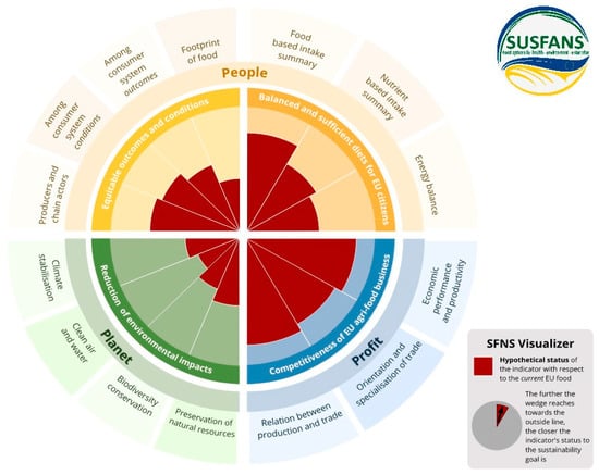 The SUSFANS SFNS-impact visualizer showing a hypothetical assessment of the current EU food system’s SFNS status.