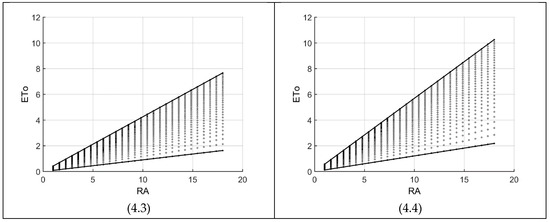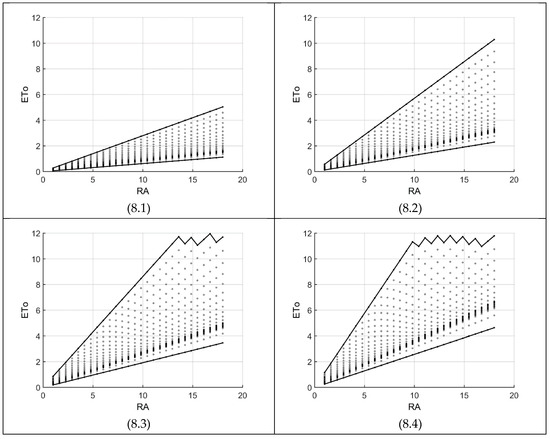 Figure 8 is an example of the great influence of Equation (7) on HS85. For example, around the RA ranges of 5 to 15, comparing Figure 8(8.2) with Figure 4(4.2) and Figure 8(8.3) with Figure 4(4.3) reveals more than 100% increase on ETo values (for both low and high boundaries). Under such situations, Tmin must decrease and Tmax increase according to Figure 1. Finally, the zigzag high boundaries of Figure 8(8.3) and Figure 8(8.4) have similar explanations as given for Figure 7(7.4), that is, for each radiation value (e.g., about 13.6 in Figure 8(8.3)), the ETo value of its next node (20 in our case) is more than the maximum (=12), hence is not included in the feasible region. With a higher resolution (more nodes), the zigzag goes toward a horizontal line at ETo = 12.