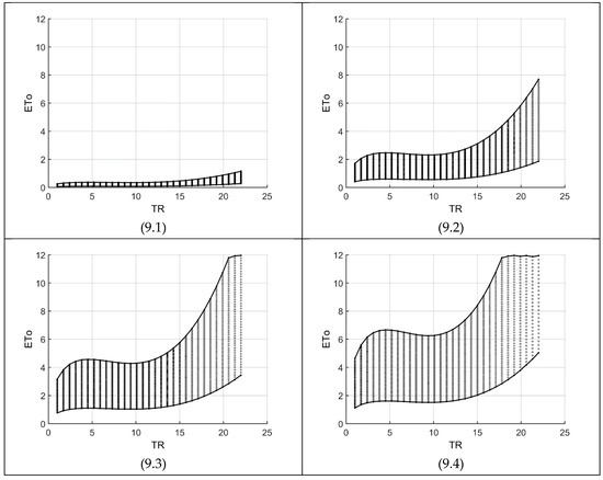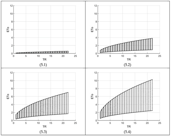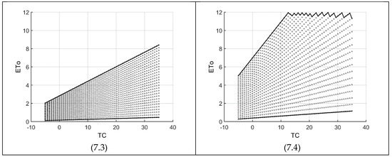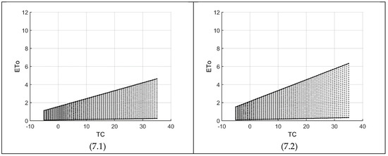 Figure 7 shows the domain variations along four specific temperature ranges (given in Table 3). As in Figure 3, each graph consists of a maximum grid of 58 × 28 for temperature (TC) and radiation (RA), respectively. As the temperature range (TR) and/or temperature decreases, the impact of radiation (RA) between consecutive nodes reduce substantially. For example, with TC = 10, Figure 7(7.2) gives an ETo difference of about 0.1 between two consecutive nodes but for Figure 7(7.3), it increases by about 35%. On the other hand, increasing RA and TR would lead to a very high range of possible ETo values. For example, one reaches the upper threshold of ETo at a temperature of 12.7 as shown in Figure 7(7.4). The zigzag high boundary of this figure means that the ETo value of the next node for a particular temperature value is more than ETo maximum (=12), hence not included in the feasible space. Consequently, with a higher resolution (more nodes), the zigzag goes toward a horizontal line at ETo = 12. Finally, it is interesting to note that Figure 7(7.2,7.3) are almost identical to Figure 3(3.2,3.3), respectively. The reason is that the KR values calculated by Equation (7) for Figure 7(7.2,7.3), are 0.174 and 0.169, respectively, which are very close to 0.170 used for Figure 3.