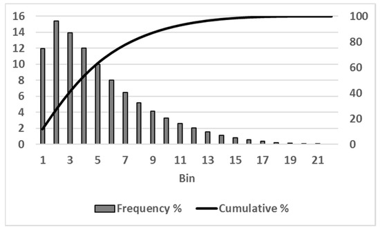 Finally, putting all the valid ETo values into bins or classes, a histogram for HS85 appears in Figure 6. It shows the ETo frequency curve, which reflects the fraction of ETo values in a bin and their cumulative values. As mentioned before, a bin has an ETo value of 0.5.