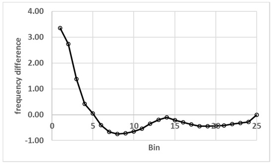 Finally, the HS00 histogram is almost the same as Figure 6 and the maximum of the frequencies still happens in bin 2. Figure 10 shows the differences between the frequencies of HS85 and HS00. There is a steep decrease from 3.4 points of frequency difference to ETo of 2.1 in bin 5 in which the HS85 values are higher than HS00 and then HS00 takes over for the other 20 bins but with smaller changes. In a sense, this was the purpose of the equation presented by Samani [21], however, HS00 creates more nonlinearities than HS85 and consequently it is not clear if it is a better model to estimate ETo.