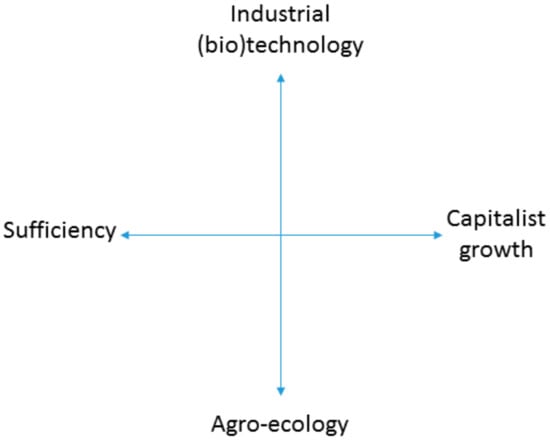 These three narratives can be located on a conceptual matrix of techno-political option space with two dimensions (Figure 1) []. The x-axis forms a political-economic dimension between sufficiency and capitalist growth, and the y-axis forms a technological dimension between industrial (bio)technology and agro-ecology.