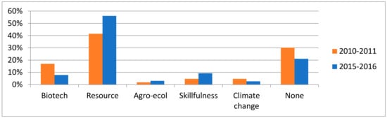 Despite the difference in the number of bioeconomy articles between 2010–2011 (106) and 2015–2016 (1158), some comparison can be made, especially between the most recurrent narratives (Figure 2). The earlier media coverage represented bioeconomy as a biotechnology more often than the later coverage, although the resource narrative also dominated the earlier coverage. However, in the earlier coverage, bioenergy was represented as being separate from bioeconomy, whereas in the later coverage, bioenergy was explicitly part of bioeconomy and, for the most part, was narrated in the resource narrative, but also in the climate change narrative.