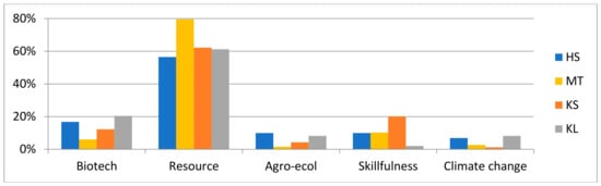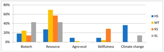 According to Hausknost et al. [], both the biotechnology and resource-centered narratives tend to lean towards the growth paradigm on the x-axis. On the y-axis, the biotechnology narrative leans understandably towards industrial (bio)technology, but the resource-centered narrative is also geared towards technology rather than agroecological processes. This makes industrial technologies within the resource-centered narrative instrumental elements in using the resources. The agroecological narrative is a balance between sufficiency and growth on the political-economic x-axis and leans towards the more holistic agro-ecology in the technological y-axis. However, despite the lesser emphasis on capitalist growth in the agroecological narrative, Hausknost et al. [] claim that, especially in the policy domain, the narratives rarely really question the growth paradigm. The support for more sufficiency-based bioeconomy often stems from NGOs and, to some degree, the research community.