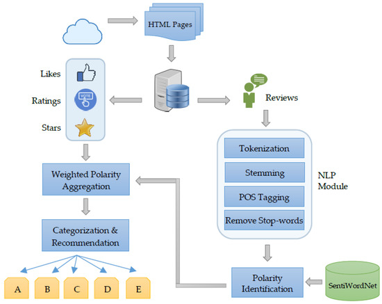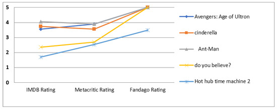 Opinion mining determines the emotions (positive or negative) of textual communication on social media, and examines the positive or negative emotions by simply extracting polarity scores from the review (number of stars or thumbs up/down and votes etc.). However, we used both the polarity score and weight score (rating, votes and likes) of the movies. First, we computed the aggregated polarity score of each movie from each participating site, and then we took the average of the aggregated polarity by total reviews of the respective movie and their site. Again, we take aggregation of average polarity score. Also, total likes of the movie were combined with weighted_average_polarity to find the aggregated_weighted_average_polarity. After that, the final score of the movie was rescaled to get the ranked score and category of the movie. In this computation, Equations (13)–(18) are used.