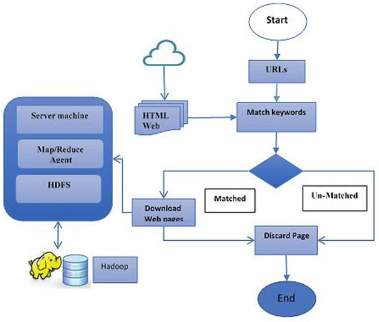 Figure A1). The user query interacts with the server and the server processes the request by forwarding it to the web crawler. The web crawler module responds to the server’s request by crawling the web for keywords (lexicons) matching and downloading the webpages to the server, and then the server processes the data to generate a recommendation as shown in