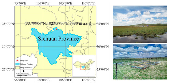 The study sample (33.79906° N, 102.95790° E) at 3430 m above sea level is located in the Zoige plateau on the northeast edge of the Qinghai-Tibet Plateau (Figure 1). It is one of the regions most sensitive to global climate change. The peat wetland of the Zoige plateau is the largest plateau wetland in China, and is also the largest and best-preserved plateau peatland swamp in the world [36,37,38]. The study area is cold and humid and belongs to the monsoon climate of the alpine, frigid temperate zone. According to the local climate data (China Meteorological Data Network), the annual mean temperature is −1.7–3.3 °C, and the mean temperature of the hottest month (July) is 8.5–12.6 °C, which is equivalent to the heat condition of the junction zone of the sub-polar continental and tundra climates. The average annual precipitation of 650–750 mm mainly occurs April through September and accounts for about 90% of the annual precipitation. The vegetation type is lowstand herbaceous swamp, and the dominant species are Carex meyeriana, Koeleria tibetica, Carex muliensis, Eriophorum gracile, Blysmus sinocompressus, Carex secbrirostris, etc. The soil at the experimental site is characterized by peat soil. The depth of peat in the vertical profile of this site is in general 1.2 m. The soil organic carbon content is between 179.36–276.41 g/kg. The bulk density of this site is 0.78. The soil pH is between 6.8–7.2. A litter layer is over the soil surface due to the residue after plant death.
