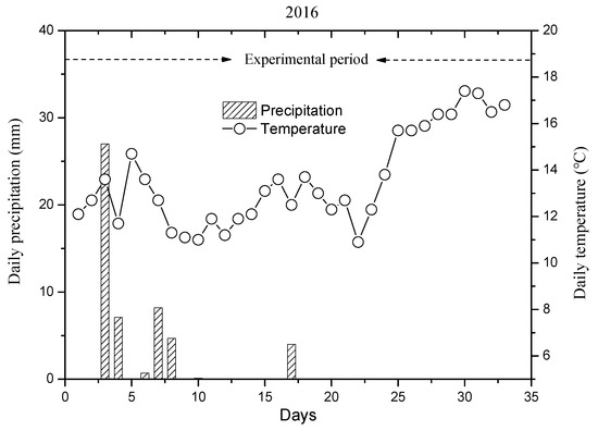 During the controlled experimental drought period (from 16 July 2016 to 26 August 2016), there were six natural precipitation events (Figure 2). The daily precipitation during this period was in the range of 0.1–27 mm, and the total precipitation was 67.9 mm, which was much lower than that of the average precipitation over the assessed 30-year time period (116.1 mm). The maximum and minimum daily temperatures during the experiment were 16.8 °C and 10.9 °C, respectively. The average temperature was 13.8 °C, which was higher than that during the same period the assessed 30-year time period (11.4 °C). In general, the climate was warm and dry during the controlled experimental period in 2016.