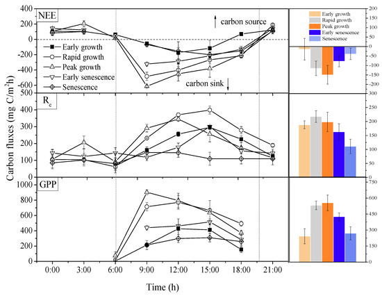 Diurnal dynamics of CO2 fluxes for different plant growth stages in 2016. Early growth: DOY 121–152; Rapid growth: DOY 153–182; Peak growth: DOY 183–244; Early senescence: DOY 245–274; Senescence: DOY 275–304. Legend: NEE, net ecosystem CO2 exchange; Re, ecosystem respiration; GPP, gross primary productivity. DOY, day of year. There were three replicates, and all the data were represented in mean ± SE.