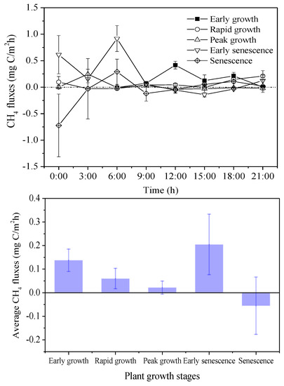Diurnal dynamics of CH4 fluxes in 2016. Early growth: DOY 121–152; Rapid growth: DOY 153–182; Peak growth: DOY 183–244; Early senescence: DOY 245–274; Senescence: DOY 275–304. DOY, day of year.