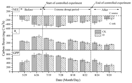 The whole growing season was divided into three stages in this study: before the control experiment (May to mid-July), the control experiment stage (mid-July to late August), and after the control experiment (late August to September) (Figure 5). Before the control experiment, there was no significant difference in NEE, Re, or GPP between CK and D (p > 0.05), and the carbon flux of the ecosystem was basically the same. During the control experiment, extreme drought significantly reduced Re and GPP (p < 0.05), with GPP and Re decreasing 14.5% and 12.6%, respectively, which resulted in a 11.3% decrease in carbon storage capacity of the ecosystem. GPP was first affected by the extreme drought and secondly by Re and NEE. After the control experiment, the enduring effects of extreme drought were still apparent, as the NEE, Re, and GPP still showed significant decreases. NEE, Re, and GPP were significantly different between the CK and D treatments on 24 August (p < 0.05), but there was no significant difference between NEE, Re, and GPP under the CK and D treatments on 20 September (p > 0.05). According to local meteorological data, there were 11 ecologically effective precipitation events from 22 August to 20 September, adding up to 134.3 mm. As a result, the extreme drought treatment gradually diminished, which alleviated the drought stress in the extreme drought treatment area to a certain extent.