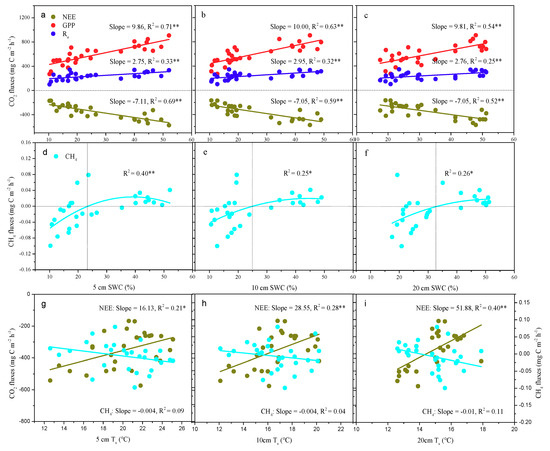 Relationships between (a–c) NEE, Re, GPP and soil water content; (d–f) CH4 fluxes and soil water content; (g–i) NEE, CH4 fluxes and soil temperature in 2016. Legend: *, significant level at the 0.05 level; **, significant level at the 0.01 level; NEE, net ecosystem CO2 exchange; Re, ecosystem respiration; GPP, gross primary productivity; SWC, soil water content; Ts, soil temperature.