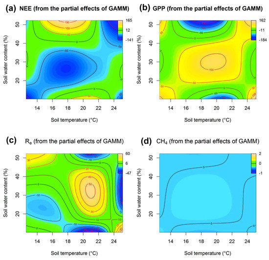 To test whether the drought effects on carbon budgets can be explained by changes in the microenvironment, the interaction between soil temperature and soil water content on NEE, GPP, Re and CH4 fluxes was also analyzed using generalized additive regression models with soil temperature and soil water content as smooth terms. In general, the strength of CO2 sink was low when soils were dry (soil water content below 15%) and wet (soil water content above 40%), and high when soil temperature and soil water content ranged from 14–22 °C and 20–40%, respectively (Figure 8a,b). Drought-induced soil water stress weakened the carbon sink capacity of the ecosystem, but within a certain range of soil temperature. Furthermore, the emission of CO2 was highest when soil temperature and soil water content ranged from 18–22 °C and 20–40%, respectively (Figure 8c). Additionally, when extreme drought led to soil water stress, the source and sink functions of CH4 for the ecosystem will change with the fluctuation of soil temperature. The function of CH4 source in ecosystem was stronger when the soil water content ranged from 20% to 40% and the soil temperature ranged from 15–21 °C (Figure 8d). These results also revealed an interactive effect of soil temperature and soil water content on the carbon dynamics to some extent, especially under drought stress.