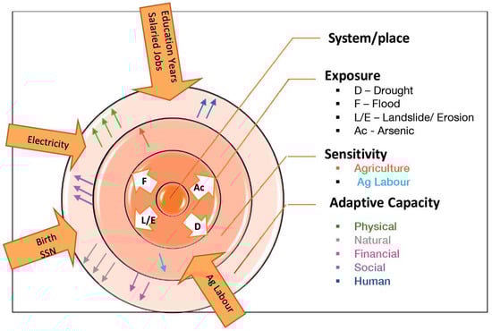 The Figure 1 indicates how vulnerability works on a system or micro level space. 22 variables perturb each other within the three spheres of vulnerability: Exposure, sensitivity and adaptive capacity, and these perturbation processes act as centrifugal and centripetal forces which indicate the level of vulnerability of a system. If the variables of an exposure unit (e.g., drought, flood, landslide/erosion and arsenic) are highly stressed, then obviously the elements of sensitivity, such as proportion of engagement of agriculture and the proportion of agricultural labor, would be negatively impacted or stressed—which turns into severe vulnerability. At the same time, the elements of adaptive capacity, such as physical, natural, financial, social, and human (for examples education year, birth, salaried jobs, electricity, SSN-Social Safety Nets), would act as centripetal forces towards the system/s. The centripetal forces try to counter the centrifugal force. If the centrifugal force exceeds centripetal force within the three spheres then the overall vulnerability of the system would worsen. In other words, when the centripetal force—that acts as planned, transformed, intervening adaptation resilience—exceeds the centrifugal force then the overall scenario of vulnerability of the system would be improved. Thus, the centripetal forces have enormous significance in reducing the localized vulnerability in the system. As the transformed vis a vis intervening adaptation strategies (centripetal forces) substantially reduce local vulnerability, these have greater implications on localized resource distribution and micro level planning.