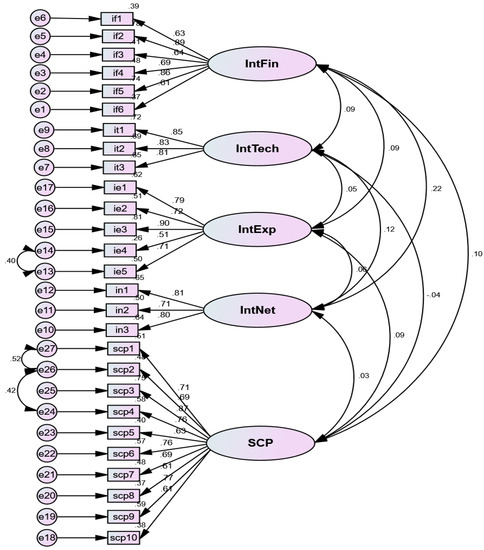 Several statistical tests were applied in this research to analyze the data. Table 3 shows the descriptive statistics of the studied variables, after ordinal to numerical transformation. It indicates minimum, maximum, mean, standard deviation (S.D.) and data normality (skewness and kurtosis) of the sample. The highest mean value is of SCP (3.63) and the lowest mean value is of international finance (2.89). International technology has the highest S.D. (0.41) while international finance has the lowest S.D. (0.29). The results show that the data are normal as all the factors have their skewness and kurtosis values lower than the cutoff ±2 as suggested by George [66].