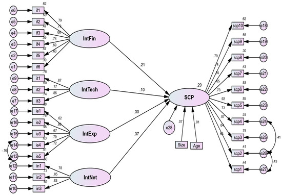 For the check for robustness, we executed regression analysis in SPSS (see Table 8). We used the same variables; international finance, international technology, international experience and international networking as independent variables and SCP as a dependent variable in the presence of two control variables: size and age of the firms. The results endorsed AMOS and confirmed that only the international technology is not a significant predictor of SCP while international finance, international experience and international networking have a significant influence on SCP.