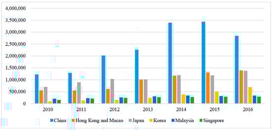 According to statistics compiled by Taiwan’s Tourism Bureau under its Ministry of Transportation and Communications for the year 2016, international visitors to Taiwan mostly came from five regions, namely, China and Hong Kong (including Macao), Japan, South Korea, Malaysia, and Singapore. However, from 2010 onwards, with the relaxation of the Cross-Strait tourism policy, the number of tourists to Taiwan from China markedly increased, reaching 3.43 million by the end of 2015, accounting for 45.80% of the total number of international visitors to Taiwan. The number of Chinese tourists in 2016, nevertheless, appears to have exhibited a significantly downward trend (see Figure 1).