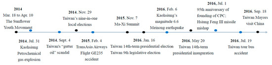 In summary, over the 2014–2016 period, there were six important political events and disasters/accidents that occurred in Taiwan and China. These important events during 2014–2016 are listed chronologically in Figure 2.