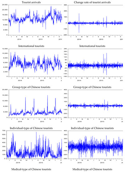 Equation (3) is the fundamental tourism finance equation, which shows that the changes in daily returns on total tourism are approximately equal to the net change rate in daily tourist arrivals. Therefore, we use the change rate of tourist arrivals to be the change rate of the total daily Chinese tourism expenditure for purpose of analysis.
