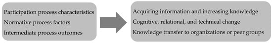 Process characteristics are factors such as participation format, access to information, facilitation, participant diversity, context, and participant characteristics. Existing research has found that participation formats which are dialogic—people interact with each other face-to-face—promote social learning more than less intensive participation processes []. However, this is disputed, since less intensive participation processes have also led to cognitive change. Independent facilitation can also lead to increased trust and legitimacy [,], which in turn foster social learning. The type and number of participants influence social learning [], but a balanced stakeholder selection is often recommended for successful participation processes []. Besides participant characteristics such as gender and age [], an individual’s degree of knowledge might also influence social learning outcomes. Furthermore, the context of the process, such as topic, pre-exiting institutions etc., has an impact on social learning processes [,].