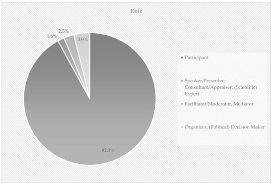 Another aspect providing information about the degree of participation is the role respondents played in the participation process. The respondents could tick up to eight categories; multiple answers were possible and are summarized in four categories in Figure 3: The majority of respondents indicated that they were solely engaged as participants (92.1 percent), 3.9 percent of the respondents had the role of organizer and/or decision maker, 2.5 percent moderated or mediated the process, and 1.6 percent took part either as an expert, consultant, and/or presenter. This shows that the results mainly refer to the experiences of average participants in decision-making processes related to the Energiewende.