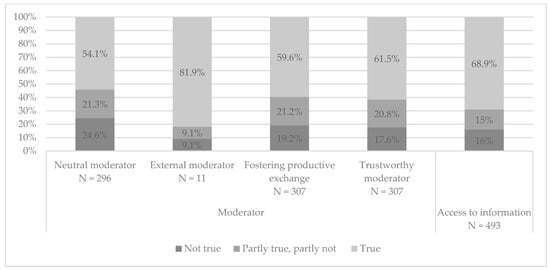 Respondents who did not indicate if they had participated as a moderator or facilitator were asked whether the participation process was moderated. Of all respondents 59.5 percent indicated that the process was moderated, and 38.4 percent indicated that the process was not moderated. (The remaining respondents (2.1 percent) indicated earlier in the survey that they had participated as a moderator, which is why this question and the follow-up questions about moderation were not included in their survey). The respondents who said that the process was moderated were surveyed on their perception of the moderation. Moderation should be neutral [,], i.e., whether the facilitation was independent of the organizer. Respondents who indicated that they had participated as an organizer or decision maker were therefore asked whether an external participant had moderated the process. A large majority (81.9 percent) of these respondents indicated that an external person had moderated the process. The other respondents were asked whether the moderation was neutral, which more than half indicated to be “true” (54.1 percent). (For better comprehension of the seven-point Likert scale, the answers are summarized as follows: the three answer categories “rather true (5), true (6), or completely true (7)” are summarized as “true”; and the three answer categories “not true at all (1), not true (2), and rather not true (3)” are summarized as “not true”). Many processes were therefore moderated by a neutral moderator. Furthermore, most respondents tended to agree that the moderation fostered a productive exchange (mean of 4.9, SD = 1.6) and was trustworthy (mean of 5, SD = 1.6). (For more details, see Figure 5)