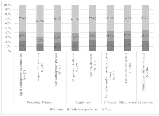 Respondents were also asked to evaluate the participation process based on the previously defined normative process factors (see Section 2). In general, most respondents viewed the overall process as fair, legitimate, effective, and efficient, and were satisfied with their own engagement (see Figure 6). Between 54.3 percent and 68.6 percent of the respondents gave the response “true” to questions about normative process factors. The processes were mainly seen as respectful (mean 5.22, SD = 1.6) and without any decision-making pressures (mean 4.89, SD = 1.8).