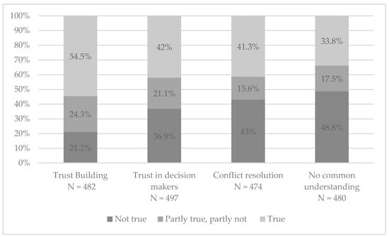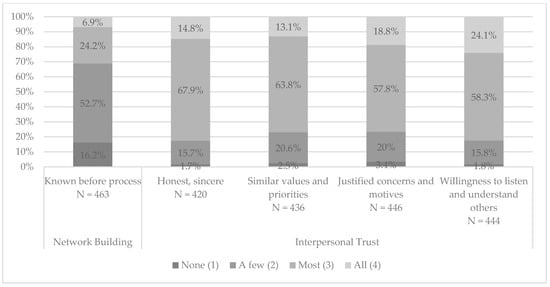 Intermediate process outcomes are factors which are developed within the participation process but do not define its final product. Trust, conflict resolution, and network building are discussed in the existing literature as important factors triggering social learning. Trustworthy relationships lead to an open exchange of knowledge and a positive debate [], which is necessary for acquiring new information or reconsidering one’s own position. Trust has multiple dimensions []. For this study, trust building, interpersonal trust (trust between the participants), and organizational trust (individuals’ trust in organizational decision makers) [] are investigated and summarized here with the term “trust”. The integration of multiple interests, which is important for social learning, is fostered by network building []. Whilst disagreement is important for social learning [], a consensus needs to be reached to make a valid decision []. Conflict resolution therefore appears to be an important factor that influences social learning.