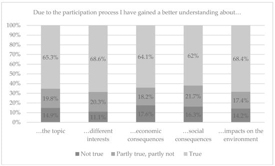 The dependent variable of social learning was assessed by means of 12 questions and measured different elements of learning. The acquisition element of social learning (acquisition of facts, information, and knowledge) was measured using a set of five questions. The results displayed in Figure 9 show that the majority of respondents gained a better understanding of different aspects of issues related to the Energiewende.