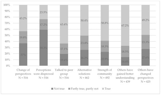 Interpersonal trust, i.e., trust in other participants’ ability to communicate honestly and negotiate in good faith, might foster social learning []. The results given in Figure 7 indicate that a large majority of respondents felt that their fellow participants were mostly honest, sincere, and willing to listen as well as genuinely trying to understand each other’s points of view. Similar results were obtained for questions about whether other participants shared the same values and priorities and reasonable concerns and motives. These results suggest that interpersonal trust was generally quite high between the participants, which helps participants to open up and share insights and information.