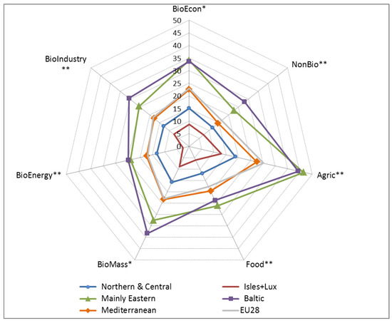 14], using their 28 output multipliers for ‘bioeconomy’, we calculate aggregate bioeconomy output multiplier for each of the five EU clusters defined in our study, and compare with the EU28 average. To some extent there is a consistency between the ranking of the aggregate output multiplier magnitudes for our five EU typologies and the relative strength of these same regional groupings reported in our analysis. For example, in the strongest group (i.e., ‘Meditterranean’), the regional output multipliers reported in Fuentes-Saguar et al. [